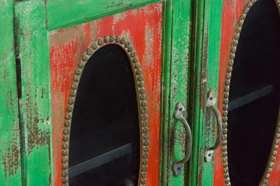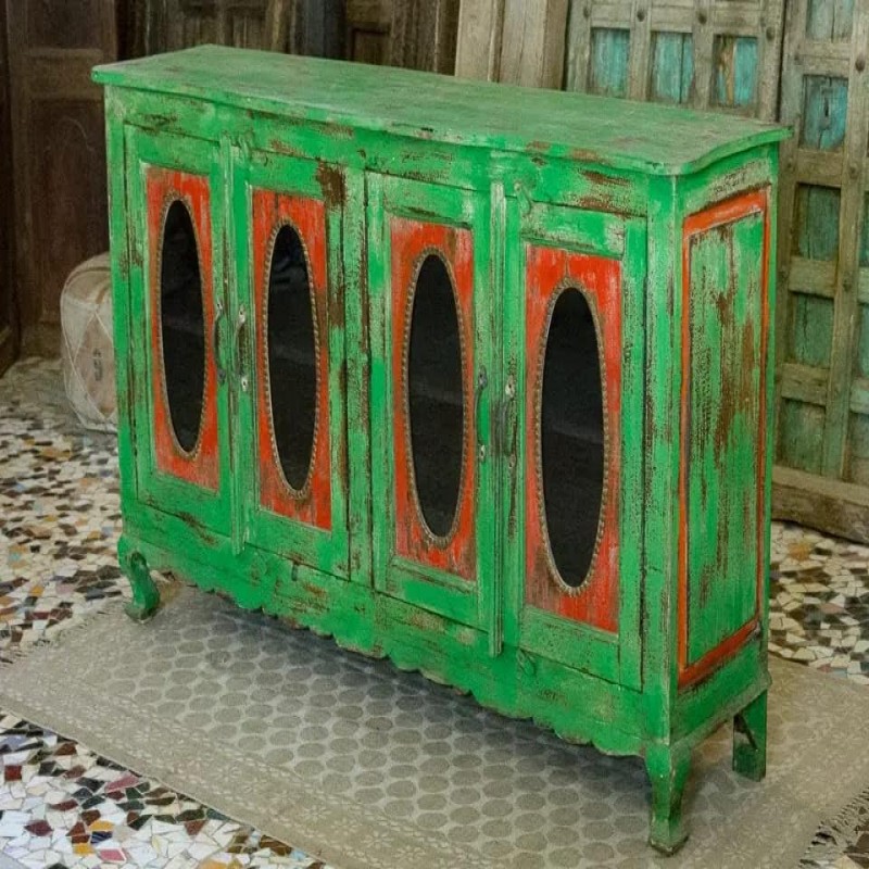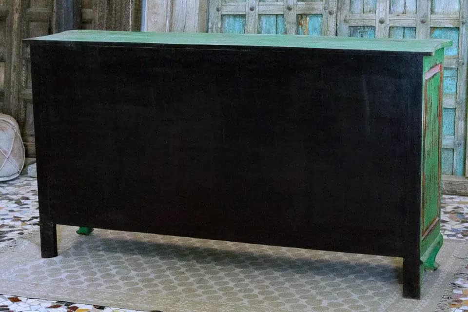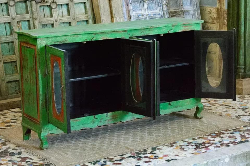 Antique Indian Brass Hand Carved Solid Wood Sideboard Green Washed Mango Wood Indian Arched Sideboard Cabinet Storage Unit Indian Solid Wood Finish, Living Room Bedroom Furniture, Modern Sideboard