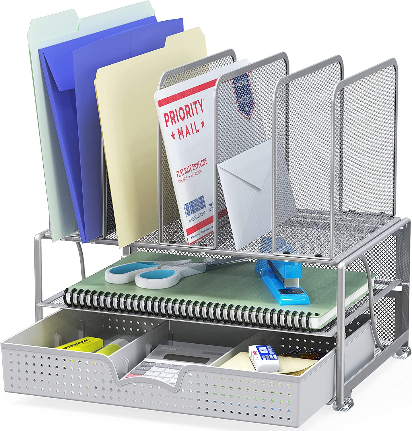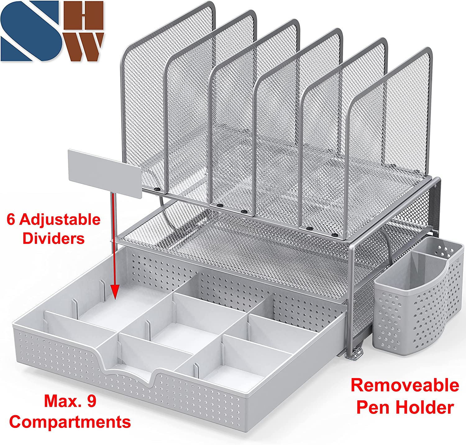 Tủ đựng đồ dùng để bàn dạng lưới SimpleHouseware có ngăn kéo trượt, khay đôi và 5 ngăn thẳng đứng, màu đen